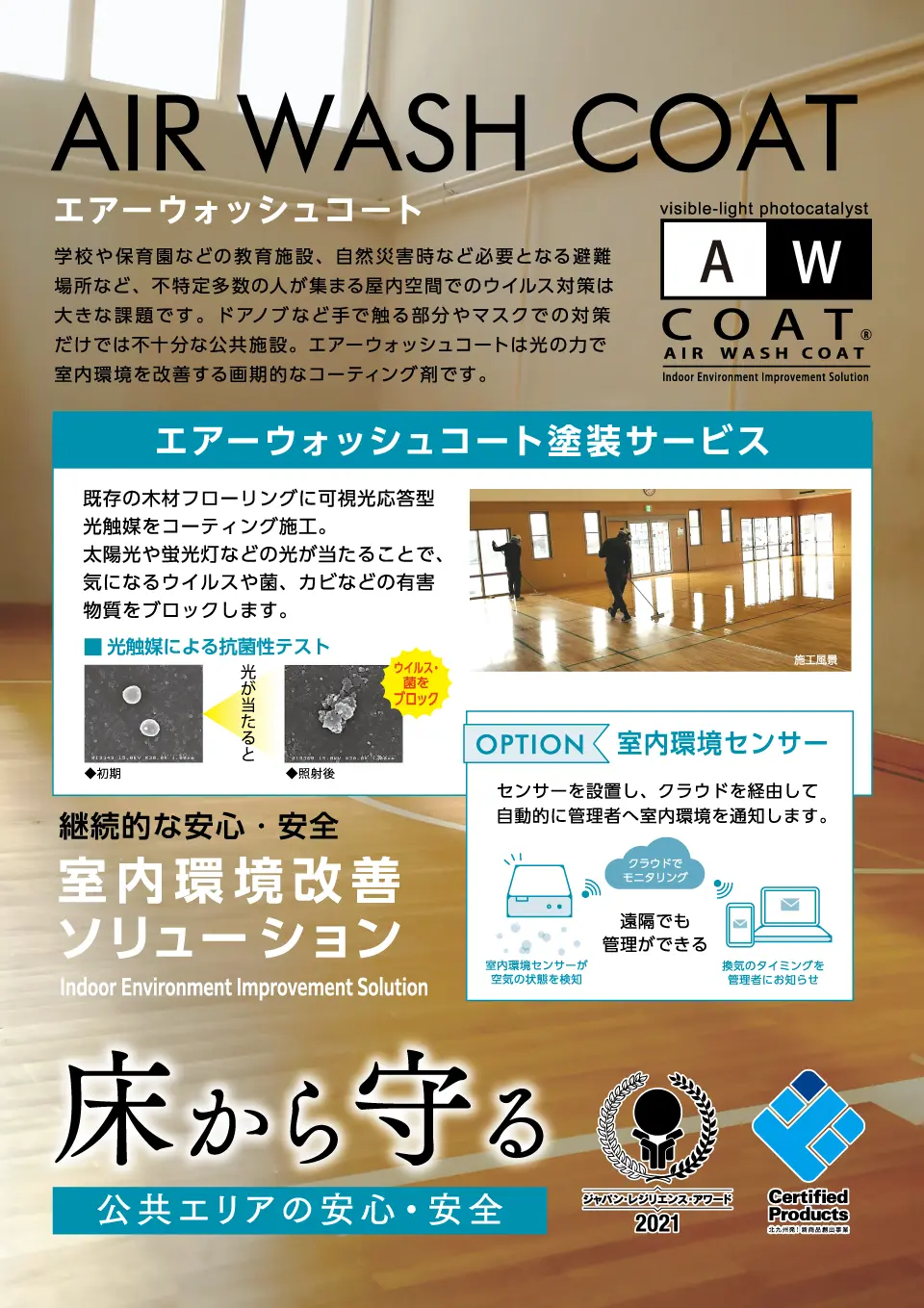 既存の木材フローリングに可視光応答型光触媒のエアーウォッシュコートを表面に塗布するだけの簡単施工で安心・安全な屋内環境を実現します!
